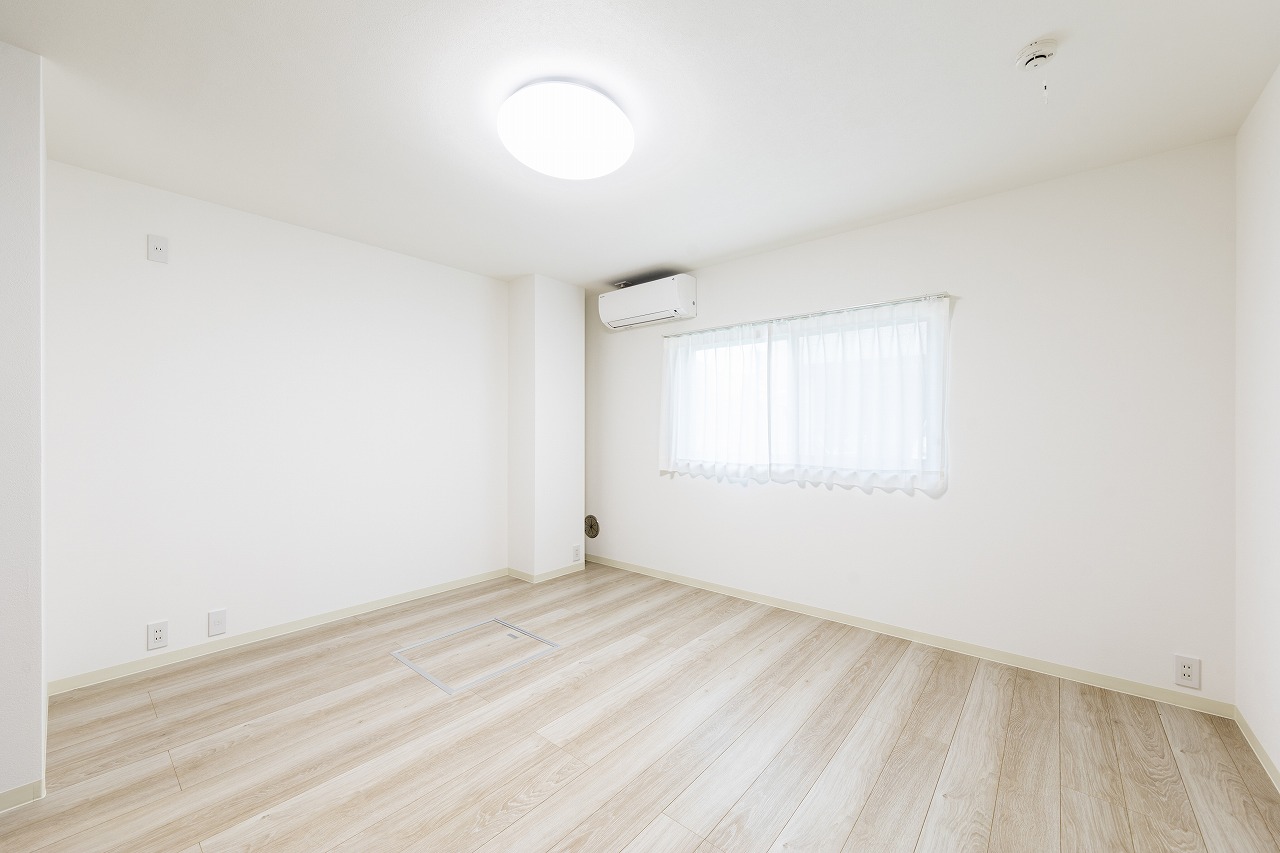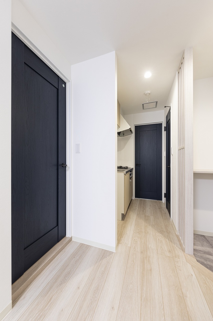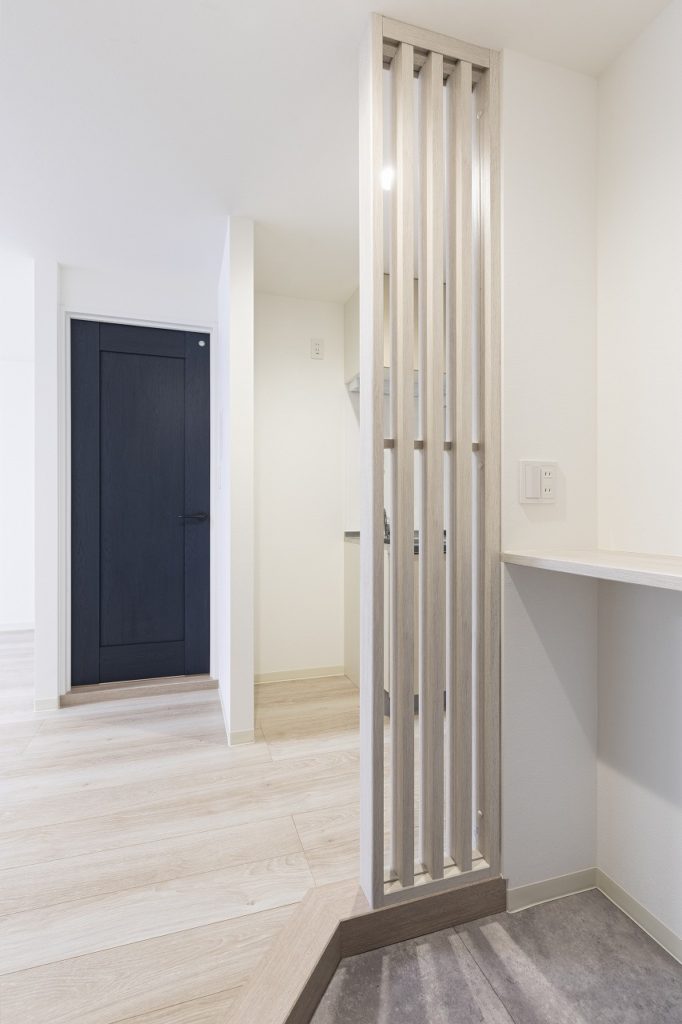 元々賃貸物件として貸していた物件の退去にともない、オーナー様ご自身の居住用に全面改装を行いました。明るくクセの無い統一感のある内装とすることで、飽きのこないシンプル仕上がりになりました。また、アクセントカラーとして採用した紺の建具が全体のイメージを引き締めてくれています。