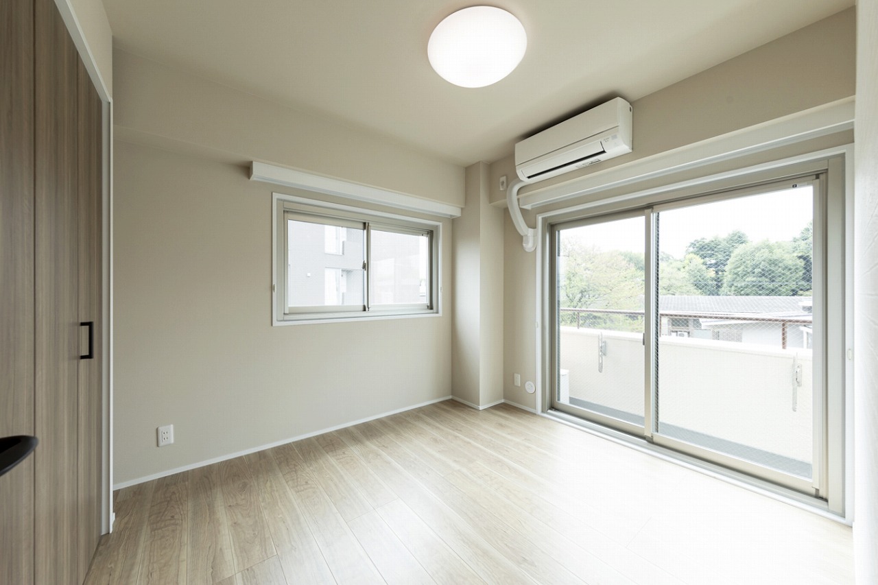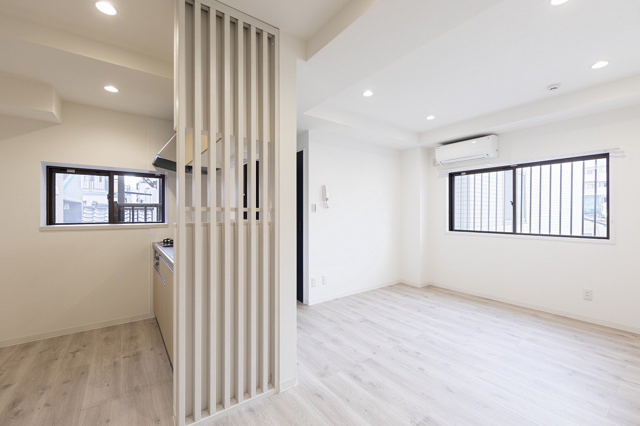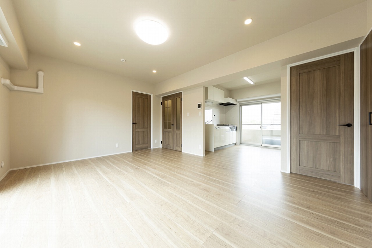 築46年のマンションを全面改装しました。日当たりの良い上層階角住戸のため既存の間取りも活かして明るく広々とした空間になるよう内装のトーンを統一。水まわり設備も一新しました。また、古いマンションのため配管関係も全て新しくして安心してお住まい頂けるお部屋になりました。